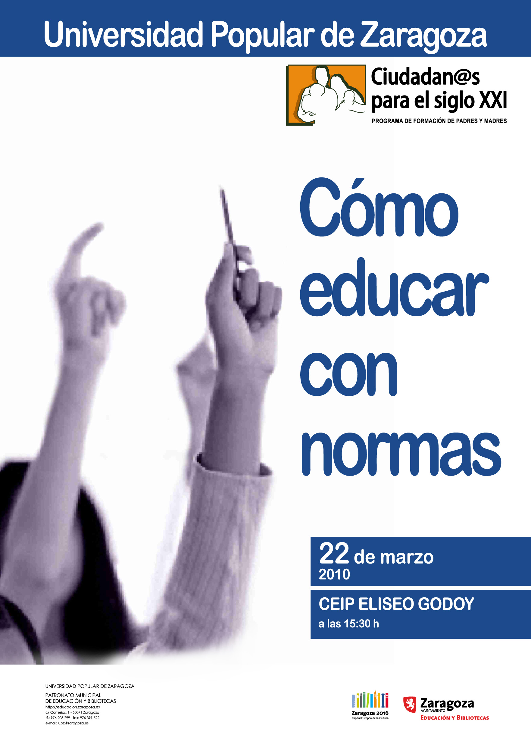 El próximo lunes 22 de Marzo a las 15:30 de la tarde tendrá lugar en la Sala de Audiovisuales del colegio la charla «Cómo educar con normas«. Esta charla la impartirá el psicólogo D. José Mª Pérez y está incluida dentro del programa de formación de padres y madres de la Universidad Popular de Zaragoza