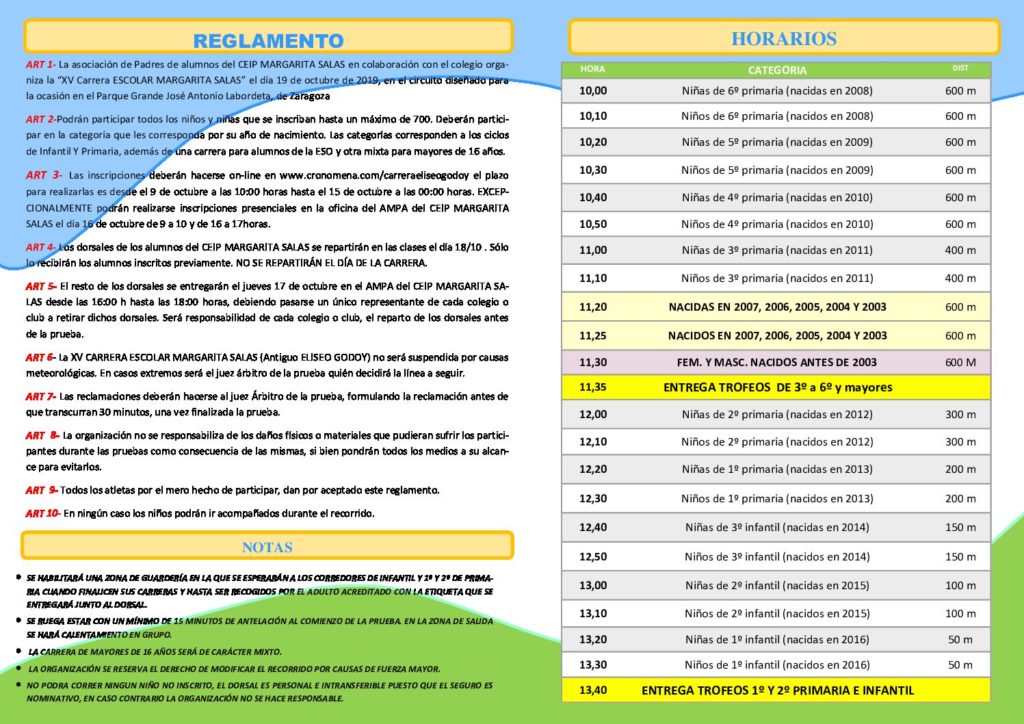 Los dorsales de los alumnos inscritos en el centro, se les repartirán en las clases el dÃa 18 de octubre. Los dorsales de familiares y amigos, que habrán sido inscritos como independientes, se recogerán en la oficina del A.M.P.A. el jueves 17 de Octubre de 16:00 a 18:00.