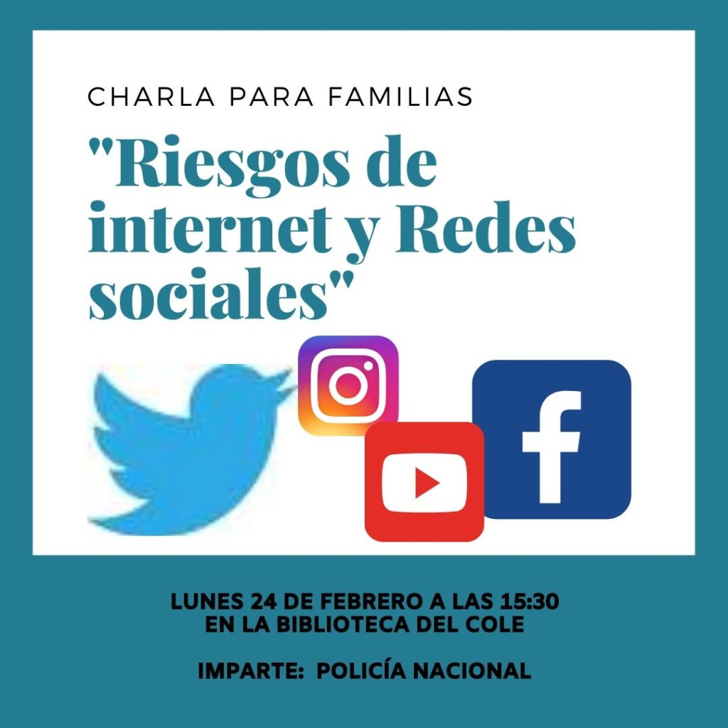 Os informamos que el próximo lunes 24 de Febrero a las 15:30 en la biblioteca del centro, tendrá lugar la charla dirigida a padres y madres «Riesgos de internet y redes sociales», que será impartida por un miembro de la PolicÃa Nacional. El objetivo es adquirir conocimientos sobre las nuevas tecnologÃas, los dispositivos digitales y el acceso a la información que ofrecen Internet y las redes sociales de manera segura.