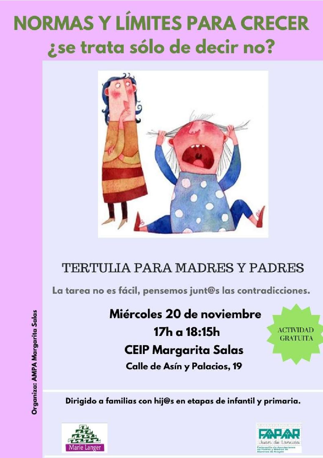 El próximo 20 de Noviembre (Miércoles) a las 17:00 en el Aula de Música del colegio tendrá lugar la charla «Los lÃmites y las normas»Â  dirigida a padres y madres del cole con hijos tanto en infantil como en primaria. Esta charla (gratuita) está incluÃda dentro del programa de formación de padres y madres de […]