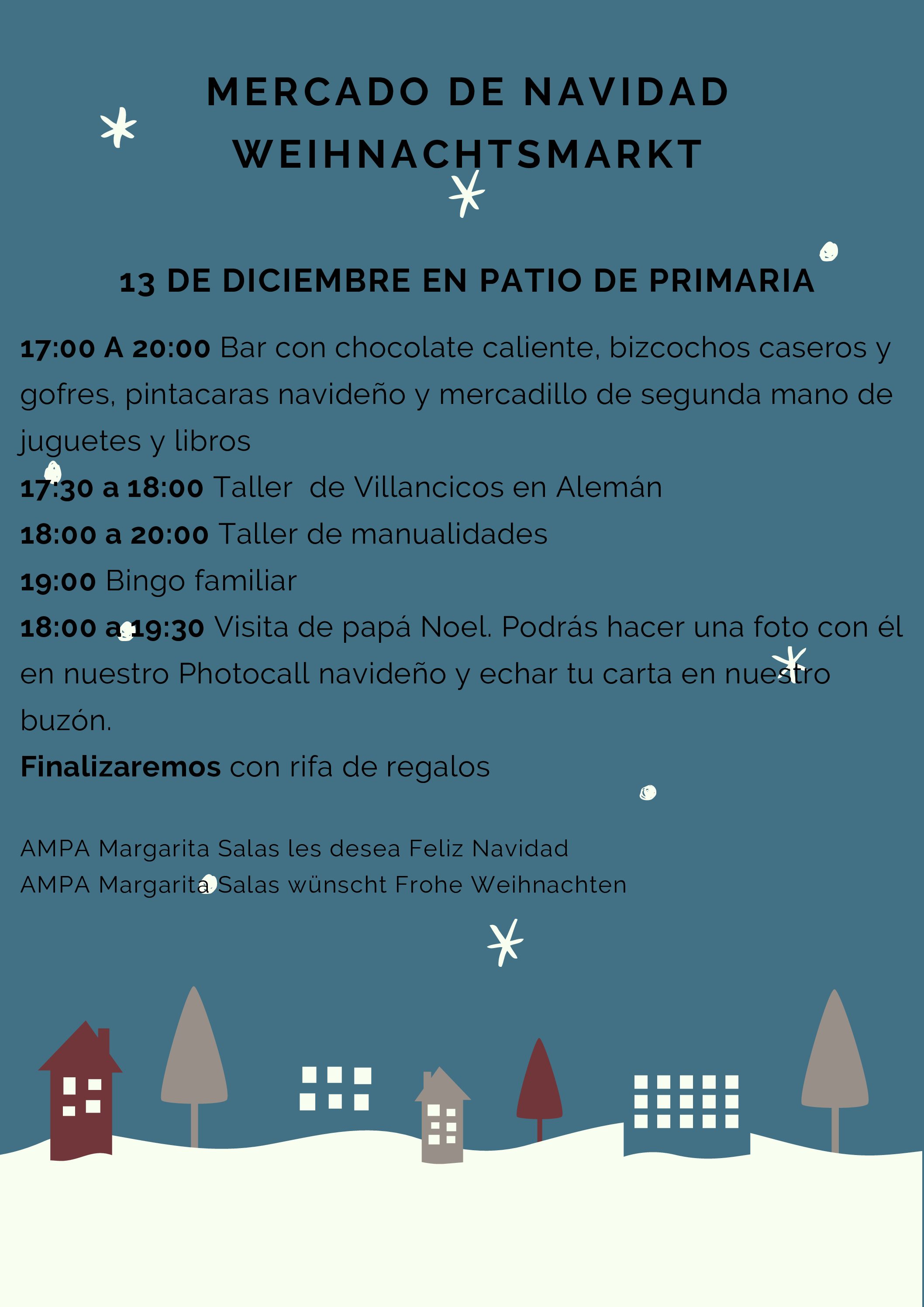 Próximo evento organizado por el AMPA: Celebración del mercadillo navideño «Weihnachtsmarkt» que tendrá lugar el viernes 13 de diciembre de 17 a 20h en el patio de recreo de nuestro colegio. Con la intención de ampliar en el colegio las fiestas relacionadas con las tradiciones alemanas, se han preparado para esa tarde diversas actividades: ï‚· mercadillo tÃpico […]