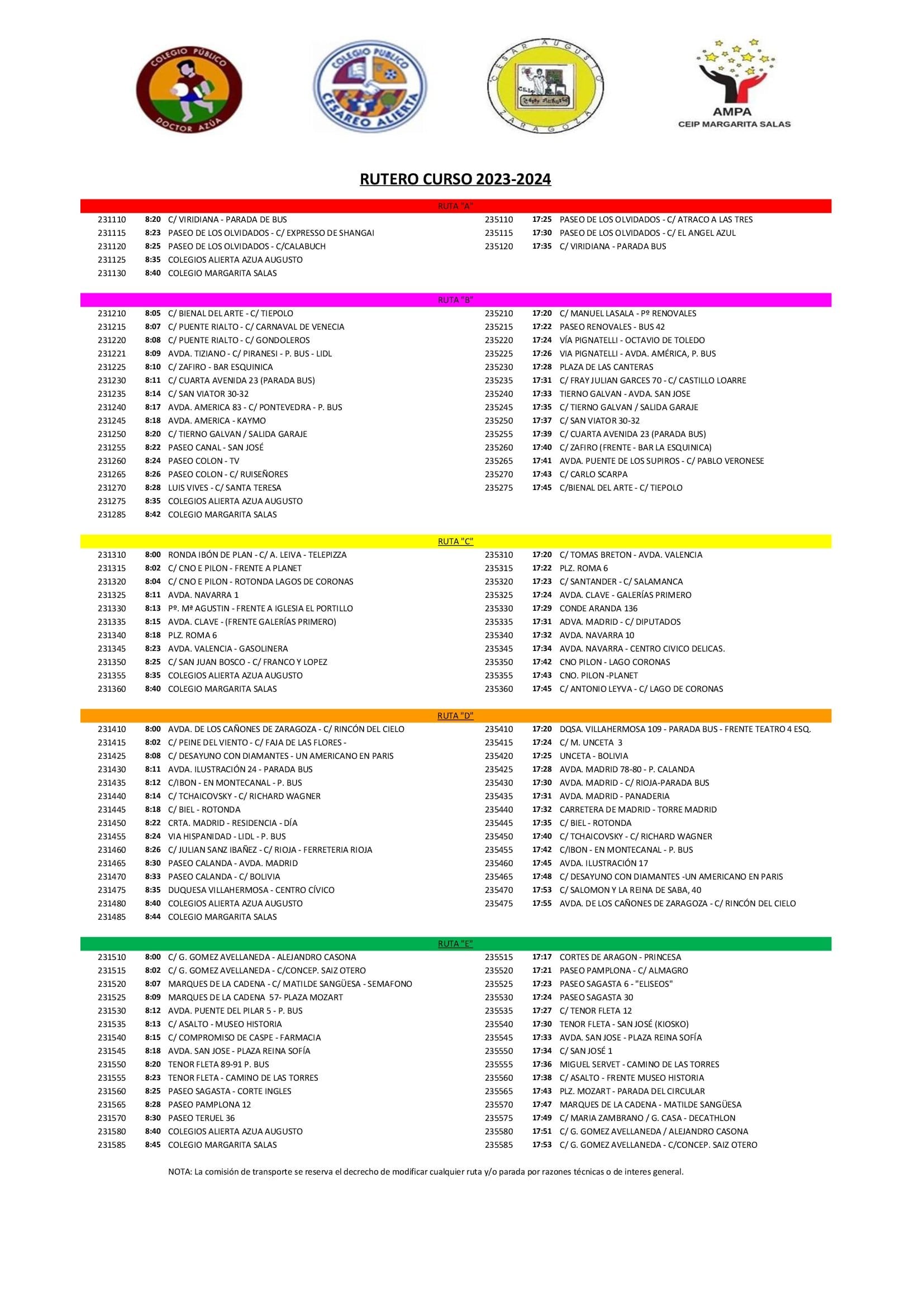 Para el curso 2023-24 habrá 5 rutas que pueden consultarse en el siguiente documento, o «rutero»: